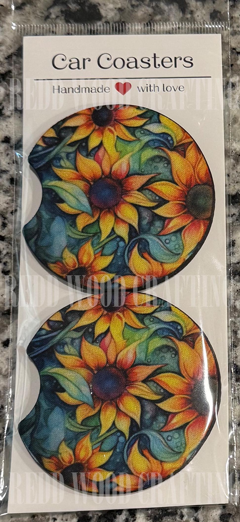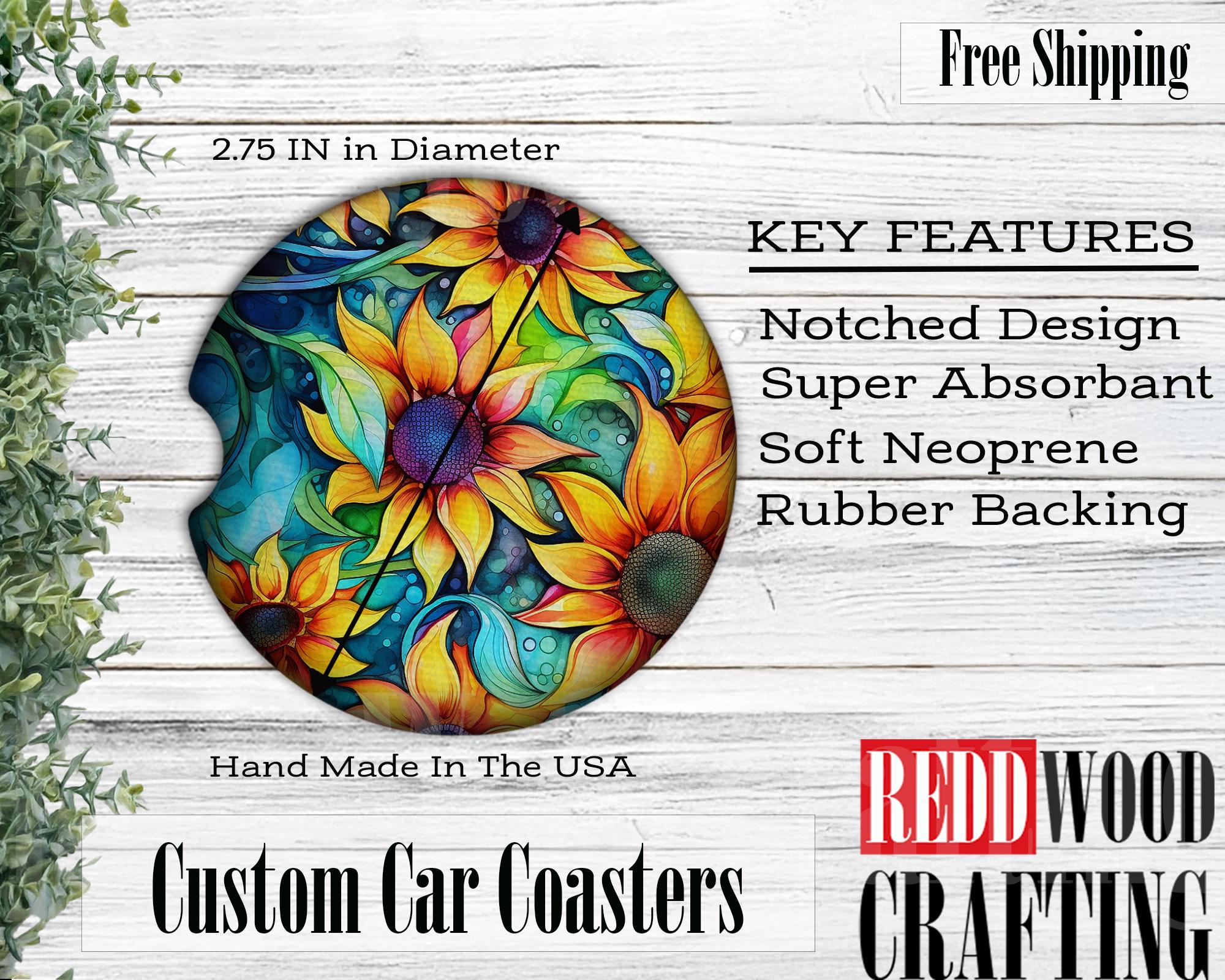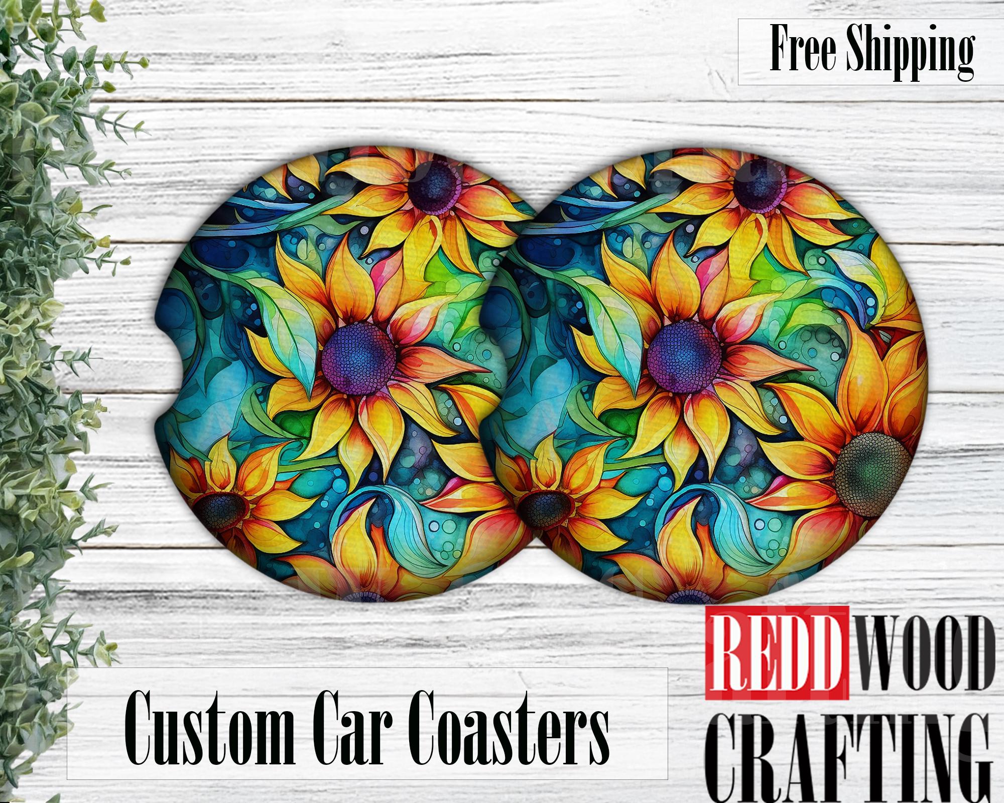 Alcohol Ink Sun Flowers Car Coasters, Car Cup Holder Accessories (Set of 2)