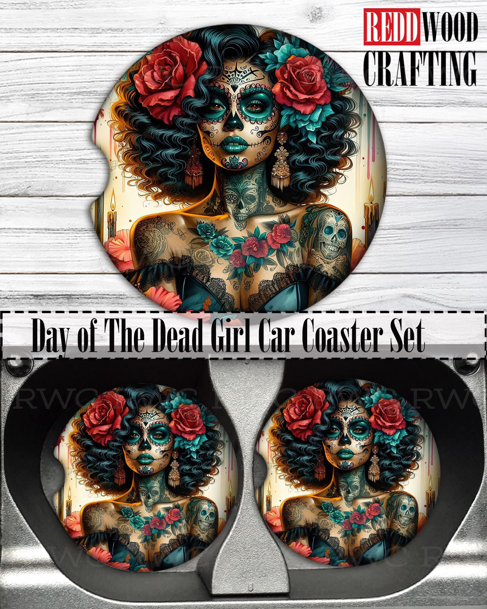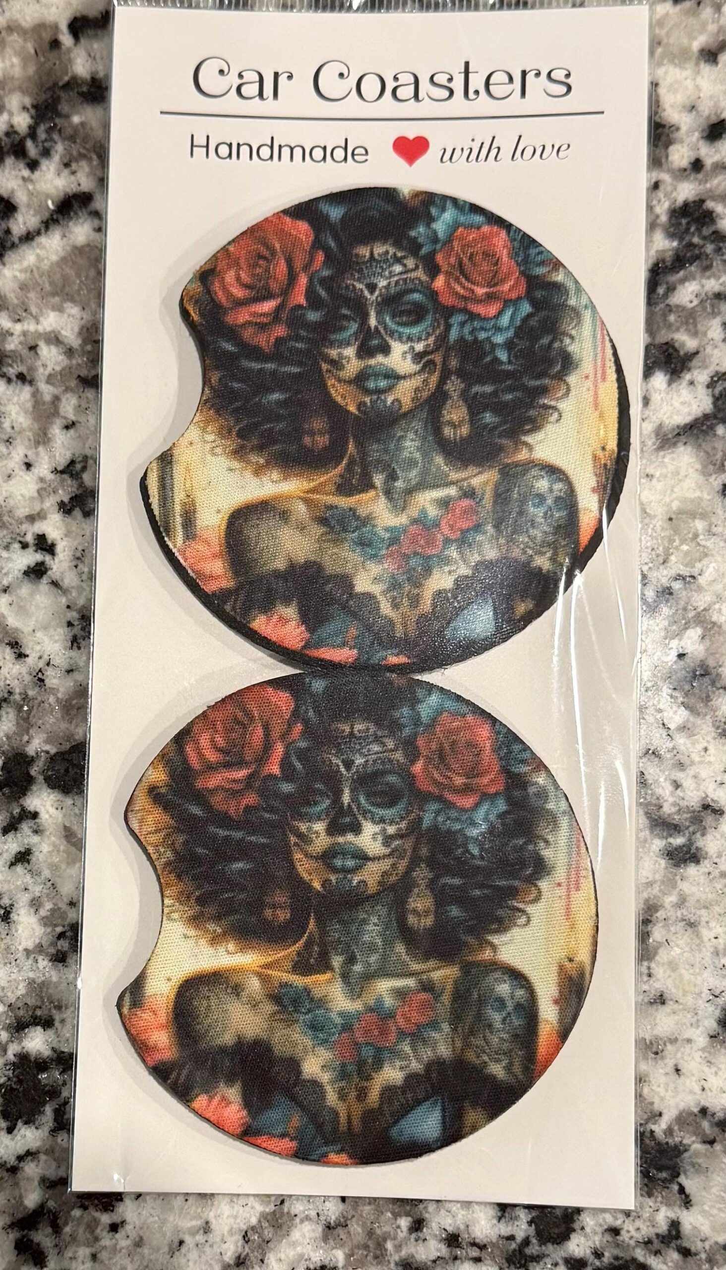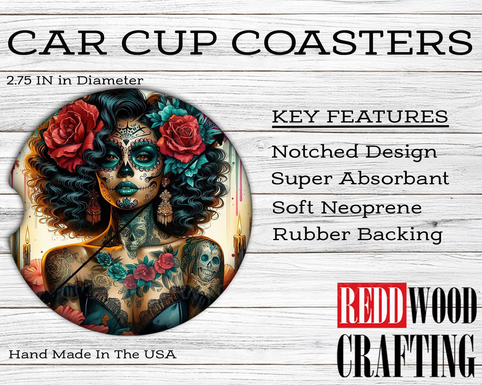 Day of Dead Girl Black, Sugar Skull, Día de los Muertos, Tattoo, Car Coasters (Set of 2), Neoprene Cup Holder Accessories