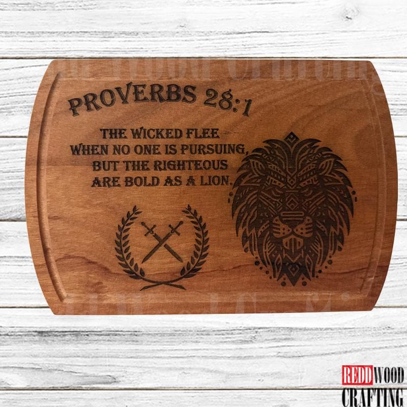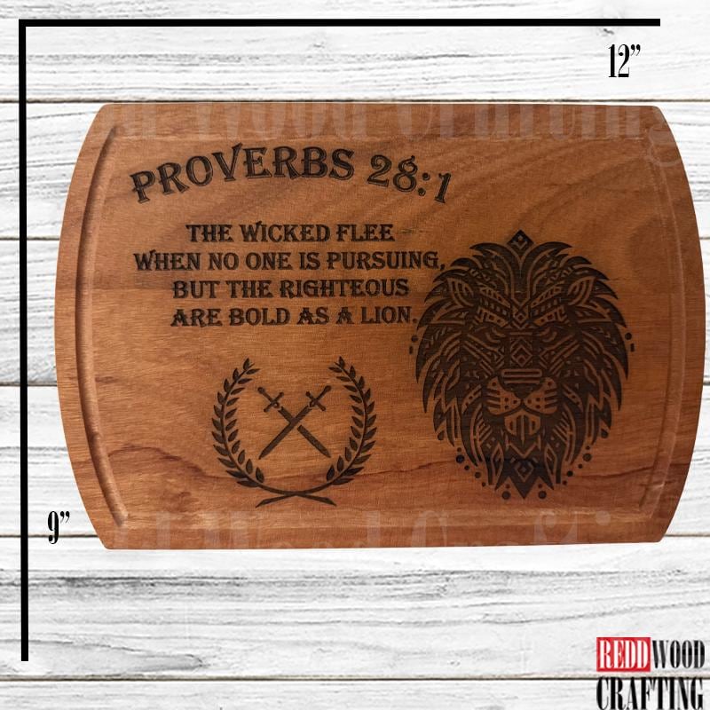 Bring timeless inspiration into your home with this Walnut Scripture Cutting Board featuring Proverbs 28:1: “The wicked flee when no one is pursuing, but the righteous are bold as a lion.”