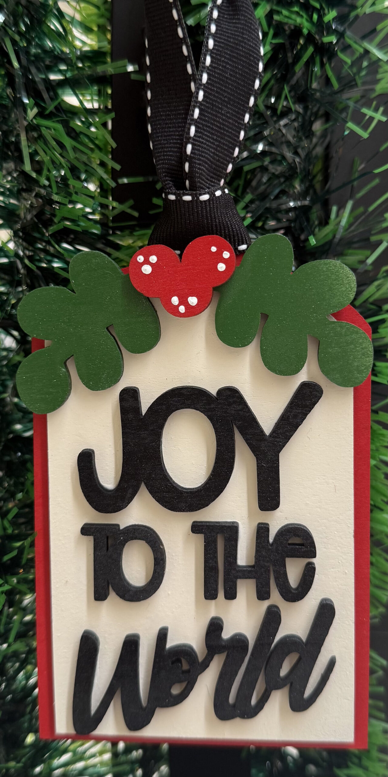 Celebrate the season with this charming “Joy to the World” hanging ornament, designed to bring festive cheer to any space. Featuring bold black lettering on a light wood-textured background, this piece is framed with a vibrant red border and topped with green holly leaves, and red berries.