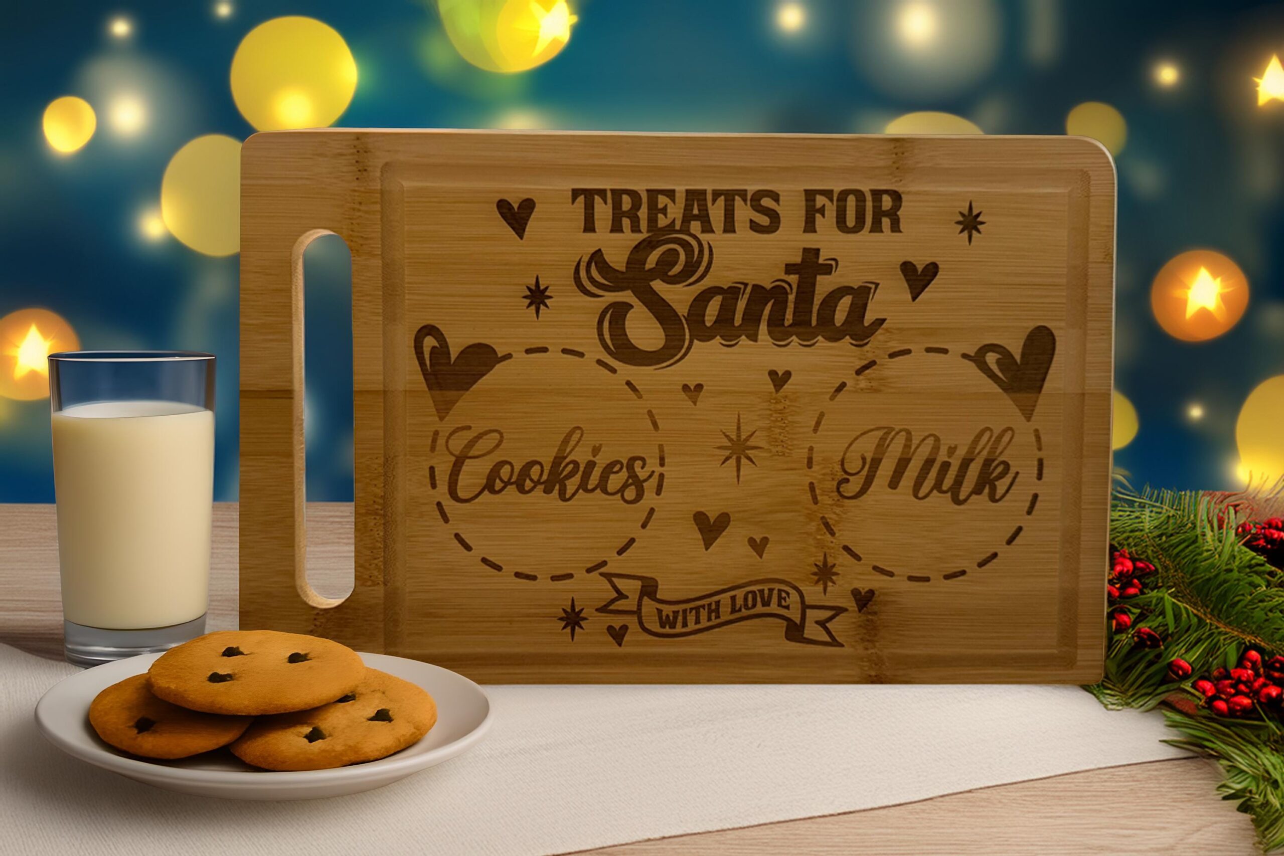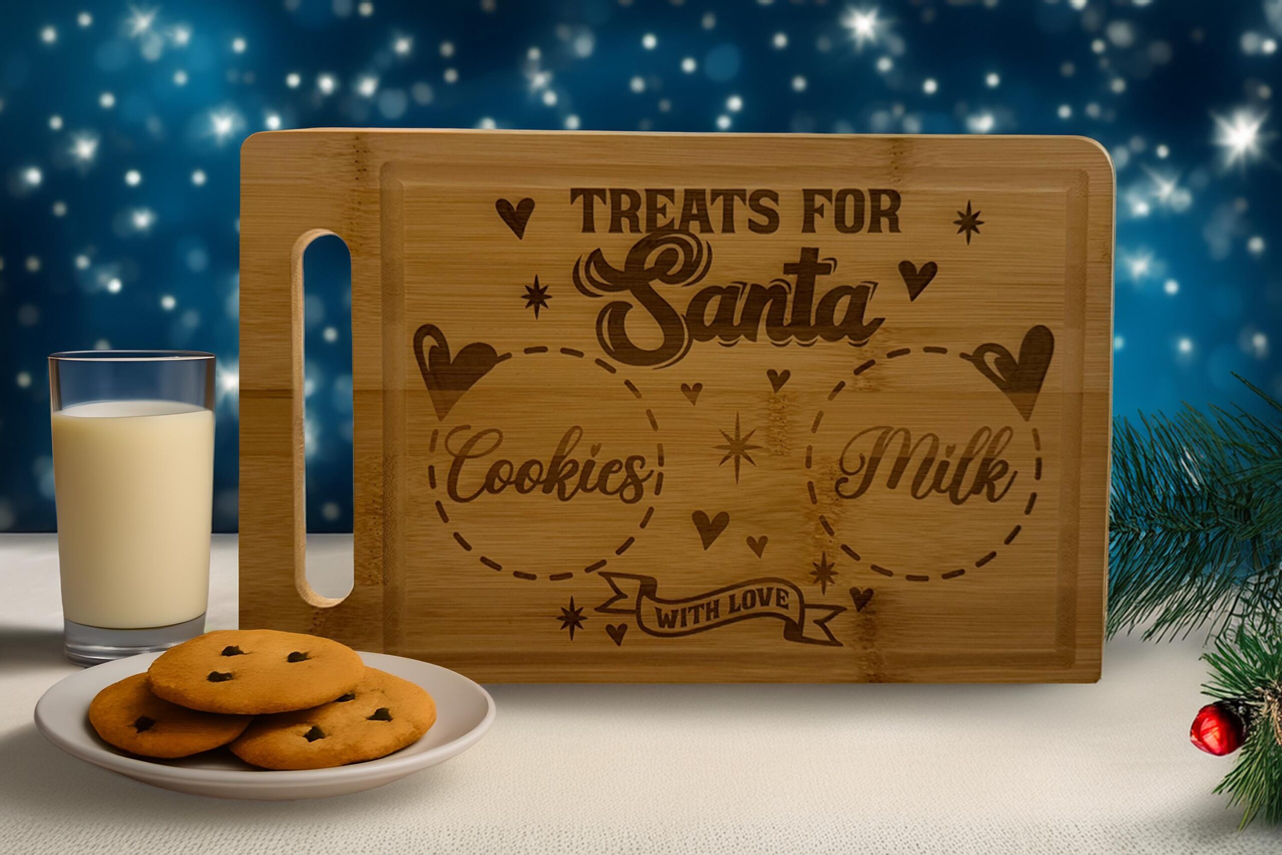 Make Christmas Eve extra magical with this “Treats for Santa” engraved bamboo cutting board! Designed with festive hearts, stars, and labeled spots for cookies and milk, this board is perfect for creating a cherished holiday tradition. A fun and functional piece that adds warmth and joy to your holiday décor.